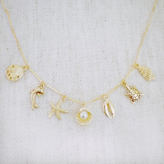 Golden Sea Charm Necklace – Shell, Dolphin & Starf